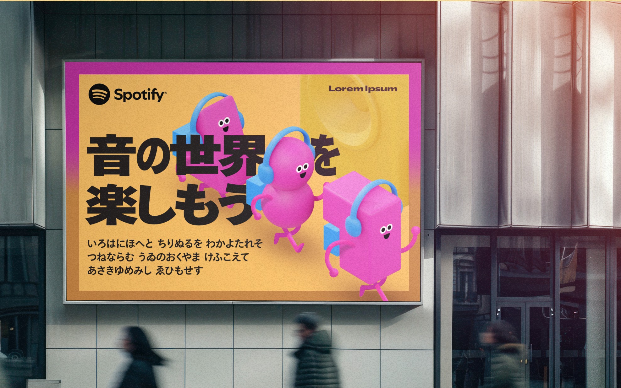日本語のタイポグラフィに最適化するには、独自の工夫が求められる。文字密度の高さ、複雑なデザイン構造、高品質な可変フォントの不足といった要素が絡み合い、デザインの難易度をさらに高めている。私たちの目標は、グローバルなブランドの一貫性を保ちつつ、日本ならではの文化的な繊細さを取り入れ、Spotifyのあらゆるコミュニケーションが統一感のあるビジュアルアイデンティティを持つこと。デジタル広告からプロダクトのインターフェースに至るまで、一貫したブランド体験を生み出すことを目指した。